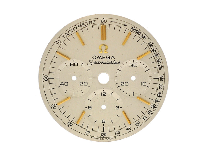 DIAL, for Omega Seamaster chronograph, "Tachymetre", 29,4 mm, damaged (7/10), approx 1965.