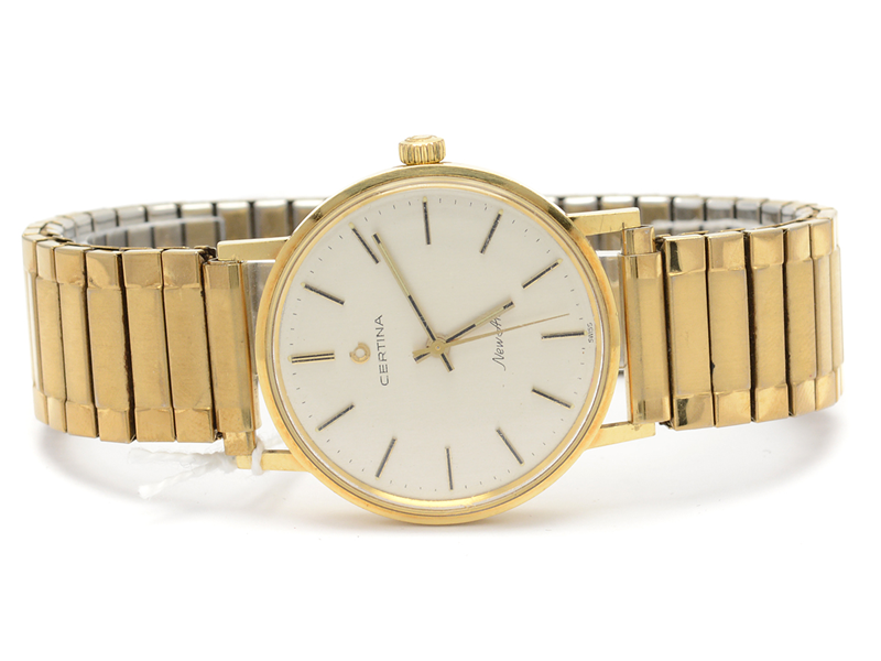 Certina men´s wristwatch New Art 18K brv. 62,1g, engraved, serienummer 441.3810.68, manual winding, flexband not orginal, scratched crystal