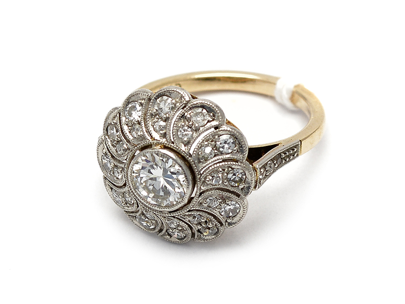 Ring double-dyed with diamonds 1xca0,65ct and 12xca0,02ct and 12xca 0,02ct Ø16 1/2 14K 4,4g