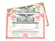 2 AKTIEBREV, Pan American World Airways, 100+15 aktier, New York, 1968-1971, perforerade.