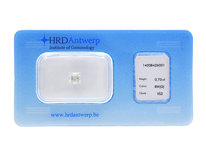 DIAMOND, princess cut, 0,70 ct, TW(G)/VS2, HRD certificate 14008426001, sealed.