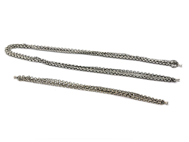 NECKLACE/BRACELET, sterlingsilver, Ole Lynggaard, 4-strand necklace and bracelet, loop-in-loop link, length 42, and 17,5 cm, Ole L case.