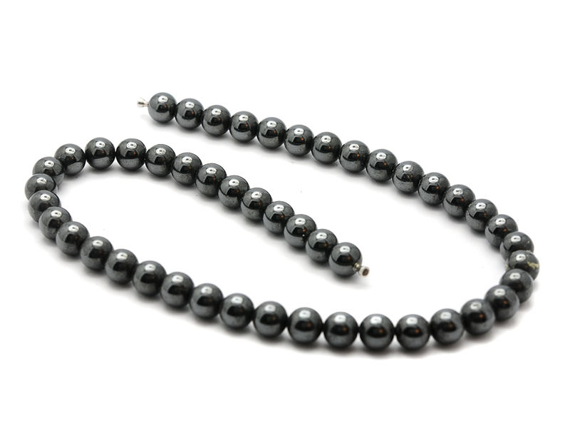 NECKLACE, 10 mm hematite beads on wire with cap ends, length 48 cm, Ole Lynggaard case.