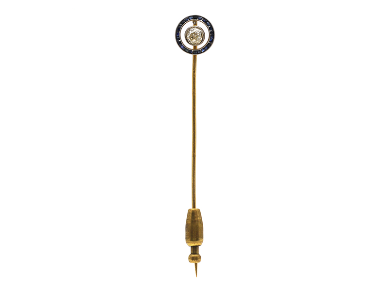 PIN, 18K gold/platinum, old cut diamond approx 0,43 ct, approx Cape/VS, 24 blue sapphires approx 0,48 ctw, Lissabon early 1900-century, weight 3 g.