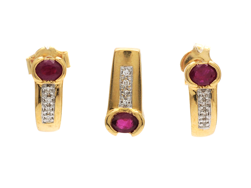 JEWELRY SET, earrings, pendant, 18K gold, 3 rubies approx 0,75 ctw, 12 eight cut diamonds approx 0,06 ctw, pushback, weight 4,0 g of total weight.