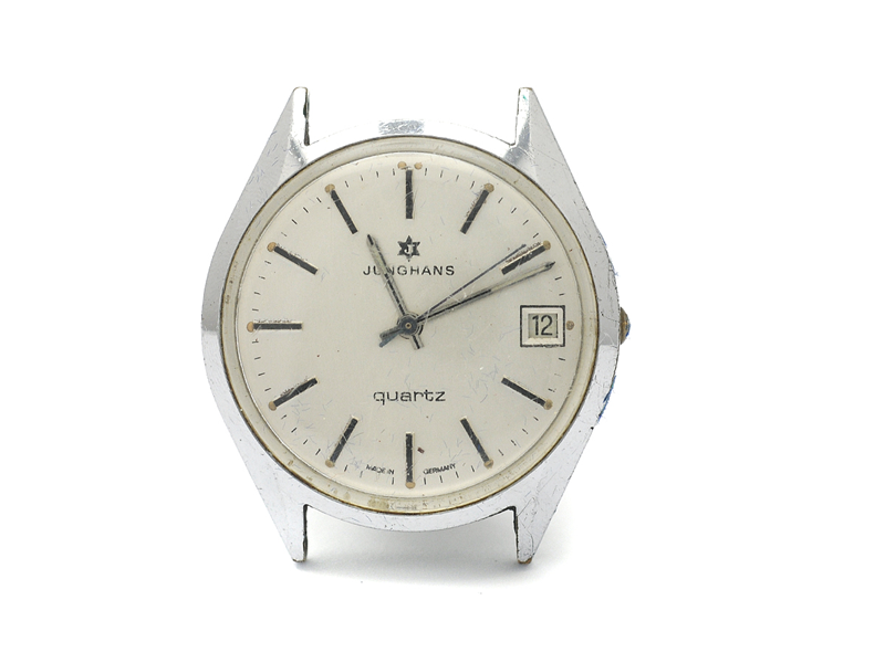 JUNGHANS, men´s wristwatch, 36 mm, Case no. 1019015, base metal, quartz, plastic crystal, date, damaged dial, not working, damaged case, approx 1980, case.