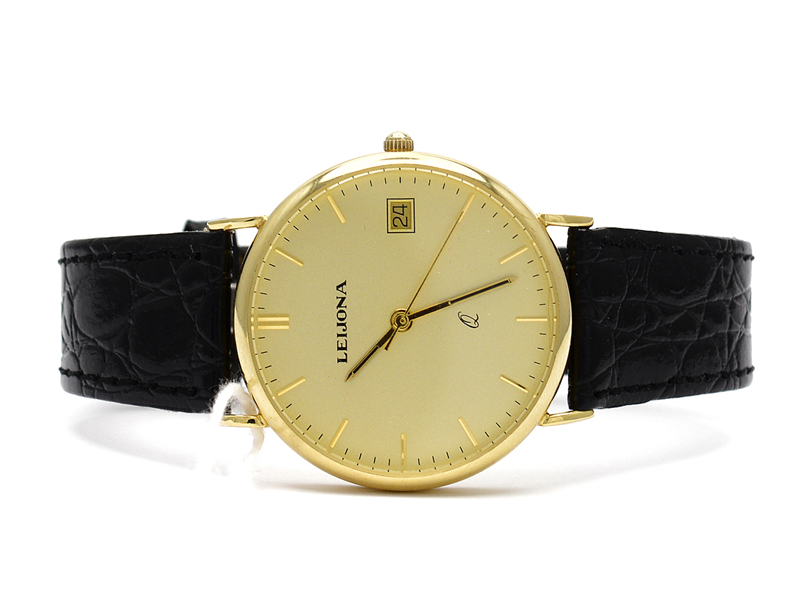 Leijona 14K, men´s wristwatch, quartz working not, date, engraved, leather strap, with certificate december 2005, in case