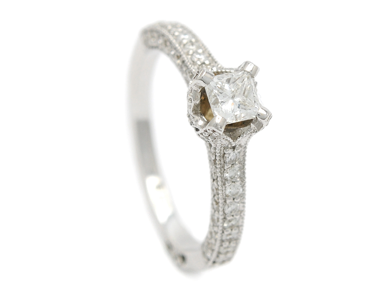 RING, 18K white gold, princess cut diamond 0,50 ct, River(E)/VVS2, copy by HRD certificate 10022901036, 74 brilliant cut diamonds approx 0,71 ctw, approx TW-W(G-H)/VS, size 17,75 mm, weight 4,2 g.
