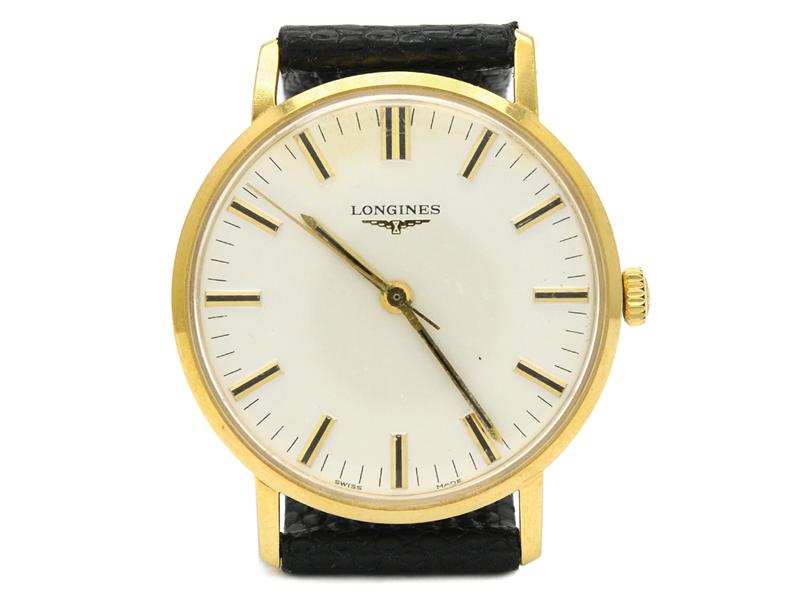 LONGINES, men´s wristwatch, 34 mm, Cal 6942, Serial no. 53428027, Ref no. 865.4030.6, Case no. 18487739, 18K gold, manual winding, plastic crystal, damaged dial, leather strap, approx 1973.