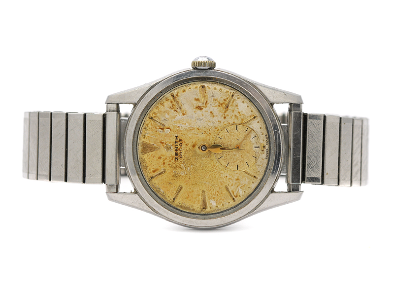 ZENITH, Pilot, Cal 40, Serial no. 4885911, Case no. 9427101, men´s wristwatch, 35 mm, steel, manual winding, crystal missing, small seconds hand, damaged dial, minute hand missing, defect, approx 1955, metal bracelet not original.