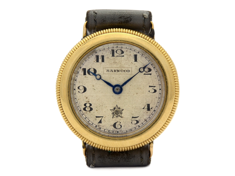 HARWOOD, men´s wristwatch, 29 mm, Case no. 240529, 18K gold, bumper automatic, plastic crystal, damaged case, dents, leather strap, approx 1930.