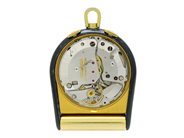 JAEGER-LE COULTRE, Memovox, travel alarm clock, 37 x 43 mm, Cal 910, Serial no. 1220362, Ref no. 10007, bicolour, mechanical, alarm, damaged case, approx 1973, certificate, leather pouch, case.