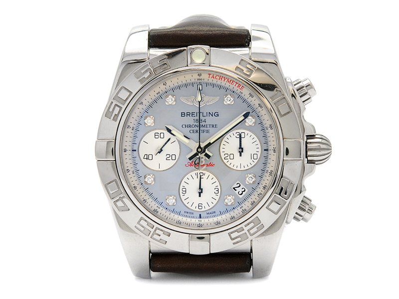 BREITLING, Chronomat 41, Chronometre, "Tachymetre", Cal B01, Movement no. 3056793, Serial no. 3056793, Ref no. AB0140, Case no. 4011B4, chronograph, men´s wristwatch, 41 mm, steel, self winding, sapphire crystal, date, mother-of-pearl-dial with diamonds (8 st. 8/8), damaged dial, damaged case, leather strap, original buckle, approx 2011, case, paper box.
