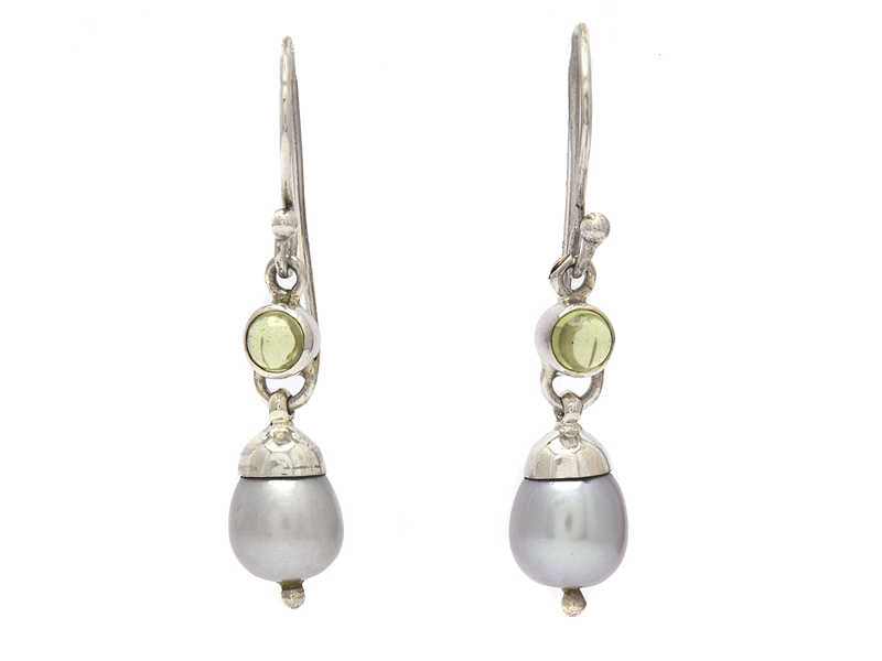 EARRINGS, sterling silver, peridot, 2 cultured drop shaped freshwater pearls 7,5 mm, weight 3,5 g, hook.