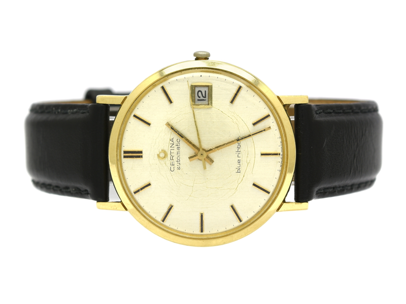CERTINA, Blue Ribbon, Cal 25-651, Ref no. 5809.148, Case no. 739764, men´s wristwatch, 34 mm, 14K gold, self winding, plastic crystal (damaged), date, damaged dial, leather strap, approx 1965, case.