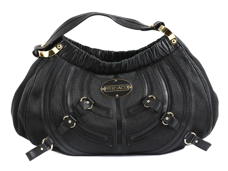 BAG, VERSACE, black leather, yellow metal details, 48x32x12cm, some worn