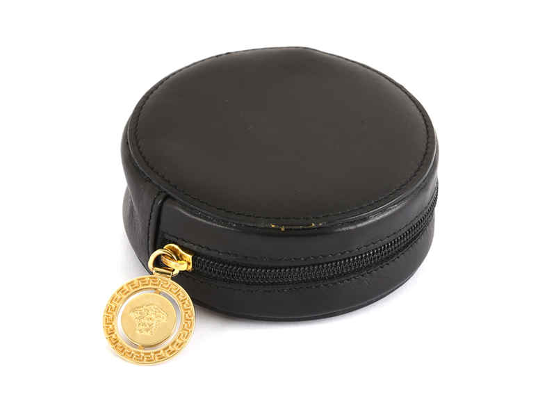 CASE, VERSACE, black leather, yellow metal details, 8x8x3cm