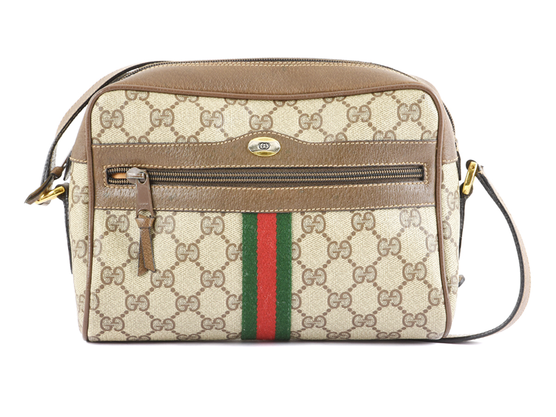 BAG, GUCCI, vintage, waxed beige GG monogram, nougat dyed leather, 22x15x6 cm, adjustable shoulder strap. Marked 56 02 004.
