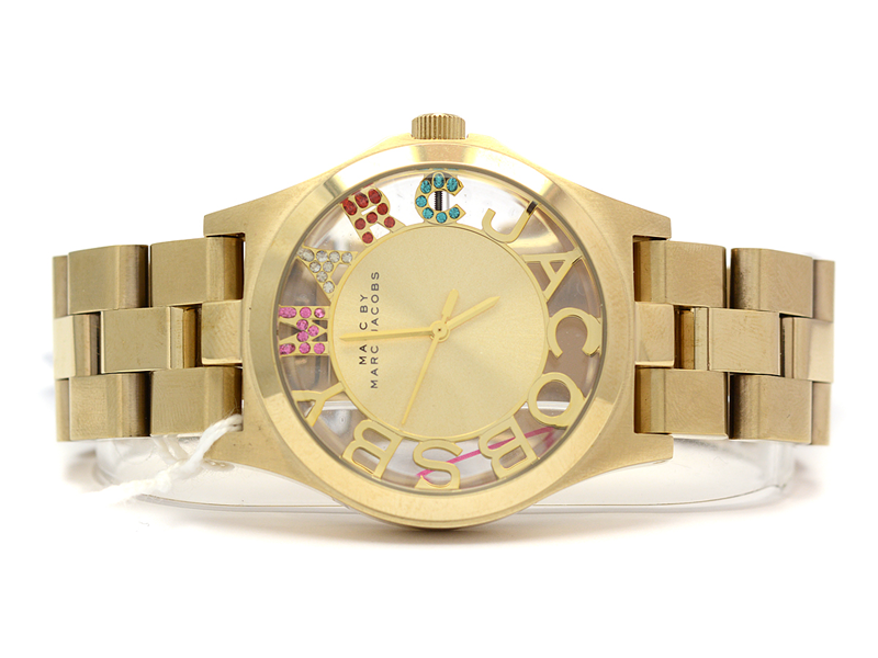 Marc Jacobs, ladie´s wristwatch, quartz, steel (goldpaint), ref: MBM3263 251402, pierced glasboett, with stones on dial, folding clasp, manual, case, working not, battery change needed