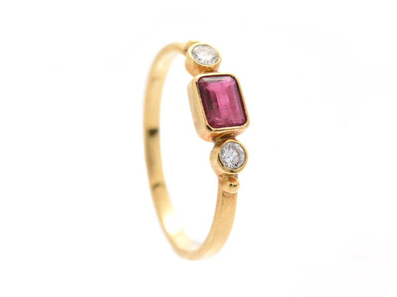 RING, 18K gold, 1 step cut ruby, 2 brilliant cut diamonds approx 0,10 ctw, approx W/VS, size 17,25 mm, weight 1.9 g, ruby with chips and surface reaching inclusions.