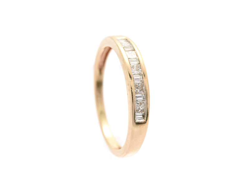 RING, 14K gold, 5 prinsess- and 6 baguette cut diamonds approx 0,27 ctw, size 16,75 mm+, weight 2,1 g.