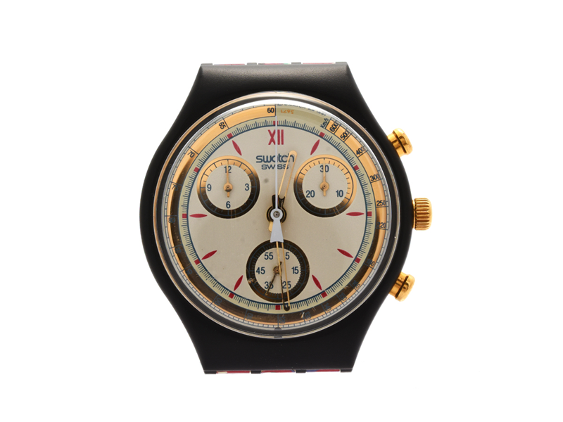 SWATCH, Chrono, Award, Ref no. SCB 108, chronograph, unisex, 37,3 mm, plastic, quartz, plastic crystal, integrated plasticstrap, original buckle, approx 1992, case.