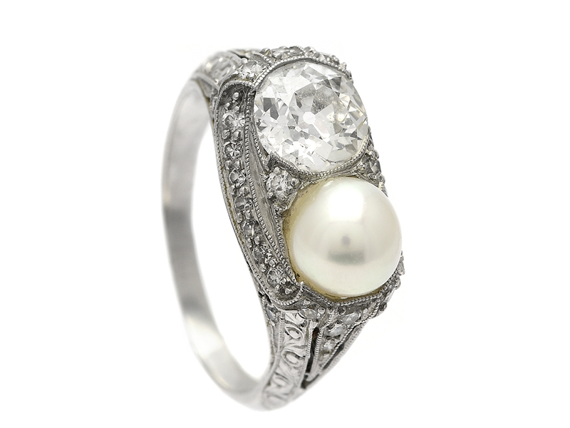 RING, 14K white gold, gammalslipa diamond approx 0,85 ct, approx Cr(J)/SI, cultured pearl, 34 brilliant- and single cut diamonds approx 0,25 ctw, approx W-Cr/VS-SI, size 15,75 mm, weight 5,9 g, skew ringshank.