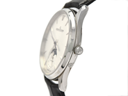 JAEGER-LE COULTRE, Master Ultra Thin Moon, Cal 925, Movement no. 3944162, Serial no. 3012499, Ref no. Q1368420, Case no. 176.8.64.S, men´s wristwatch, 39 mm, steel, self winding, sapphire crystal, date, moonphase, crystal backcase, leather strap, folding clasp, certificate, February 2015, case, paper box.