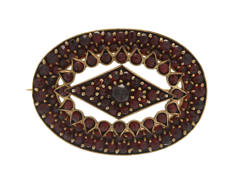 BROOCH, yellow metal, garnets, weight 8,6 g.