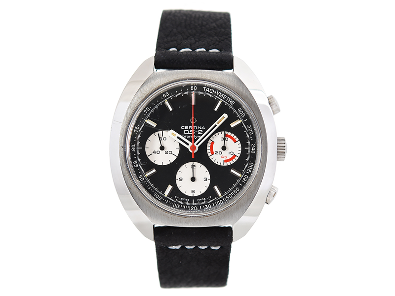 CERTINA, DS-2, Chronolympic (T - Swiss Made - T), "Tachymetre", Cal 29-062 (Valjoux 72), Serial no. 7218221, Case no. 8501.300 (C.B), chronograph, men´s wristwatch, 42,5 x 40,5 x (48) mm, steel, manual winding, plastic crystal, leather strap, original buckle, approx 1968.