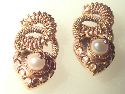 EARRINGS, ca 9K gold with cultured pearls and rubies.