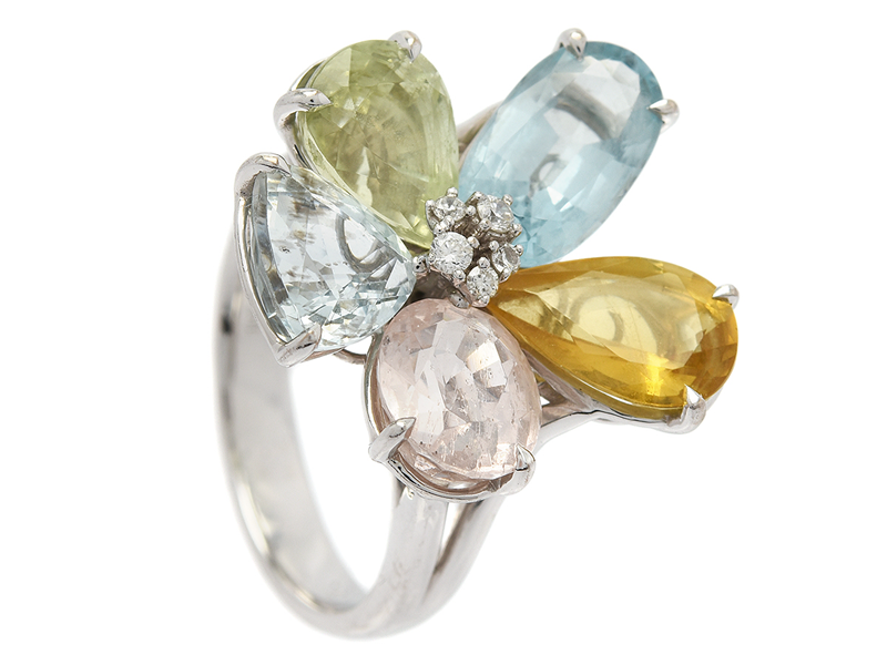 RING, 18K white gold, aquamarine, citrine, tourmaline, morganite, 5 brilliant cut diamonds approx 0,07 ctw, approx W(H)/VS, size 17 mm, weight 7,1 g.
