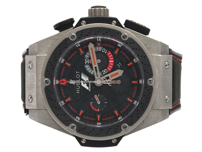 HUBLOT, Genève, King Power, "F1", Cal HUB4100, Ref no. 703.ZM.1123.NR.FM010, Case no. 855474, chronograph, men´s wristwatch, 48 mm, zirkonium / titanium / ceramics, self winding, sapphire crystal, date, crystal backcase, integrated rubber strap, folding clasp i black titanium, approx 2012, case (damaged), paper box (damaged), ca 2012. Limited and numbered (No. 05/500).