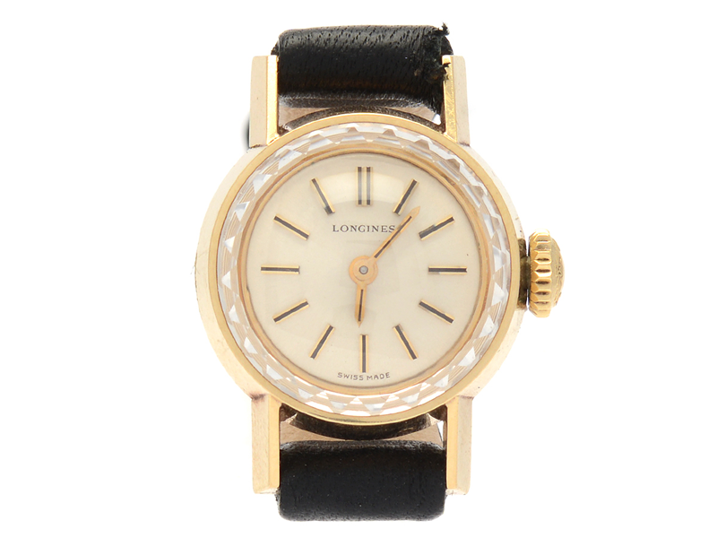 LONGINES, ladie´s wristwatch, 18,5 mm, Cal 14.162, Serial no. 13001786, Case no. 7441 1 / 96, 14K gold, manual winding, sapphire crystal, damaged dial, barrel shaped movement, leather strap, approx 1966.