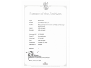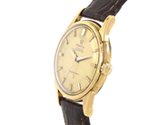OMEGA, Constellation de Luxe, Chronometer, s.c. "Pie-Pan", Cal 551, Serial no. 17228839, Ref no. OT 14381, Case no. 14381/2 SC-7, men´s wristwatch, 34,5 mm, 18K gold, self winding, plastic crystal, dial in 18K gold, leather strap, "Extract of the Archives", manufactured 12/10 1960, delivered to Sweden, case.