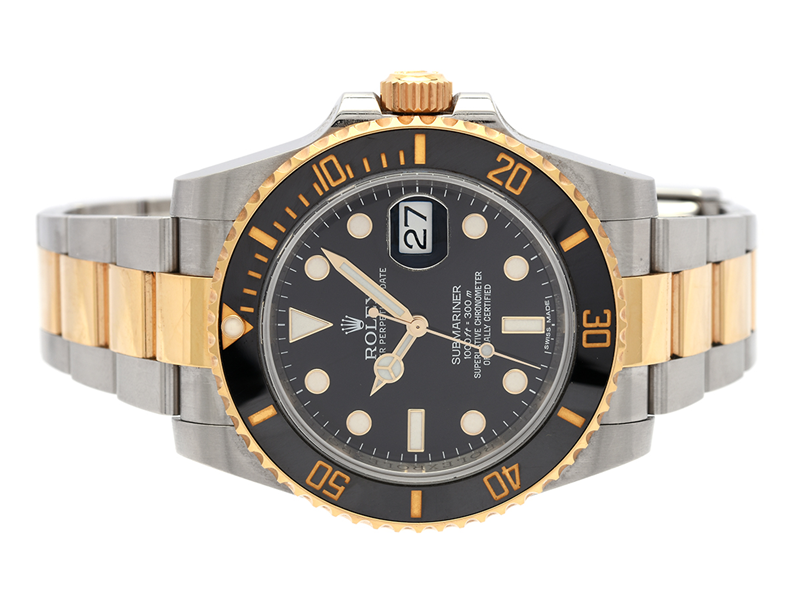 ROLEX, Oyster Perpetual Date, Submariner (1000ft = 300 m), Chronometer, Ref no. 116613LN, Serial no. 100J2077, Cal 3135, Movement no. 69G992D2, Case no. 2360, men´s wristwatch, 40 mm, steel/gold, self winding, sapphire crystal, date, black ceramic bezel, Fliplock bracelet, folding clasp (Glidelock), Ref no. 97203-2HZ/9VK, certificate, April 2015, case.