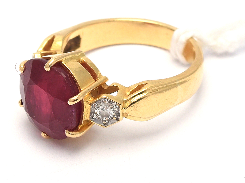 Ring 18K Ø14¾ brv 5,3g with red stone and diamonds 2 x approx 0,05ct, stone are somewhat worn