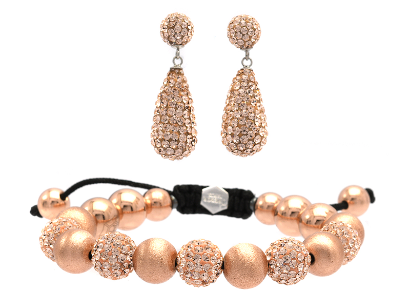 TRESOR PARIS, set of jewellery, bracelet and earrings, gilt stainless steel, titanium, crystal glass, adjustable size, case and jewellery bags.