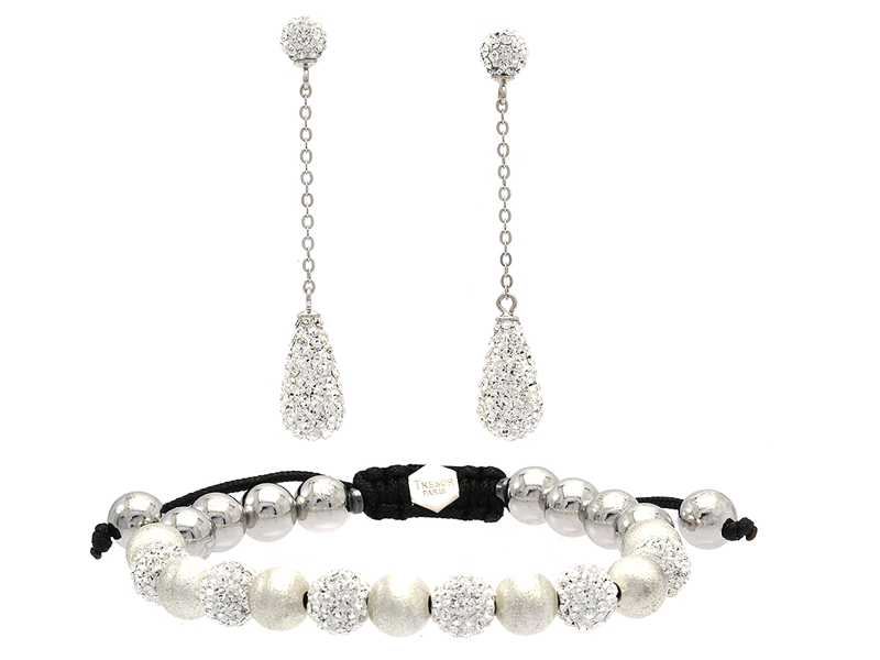 TRESOR PARIS, set of jewellery, bracelet and earrings, stainless steel, titanium, crystal glass, adjustable size, case and jewellery bags.