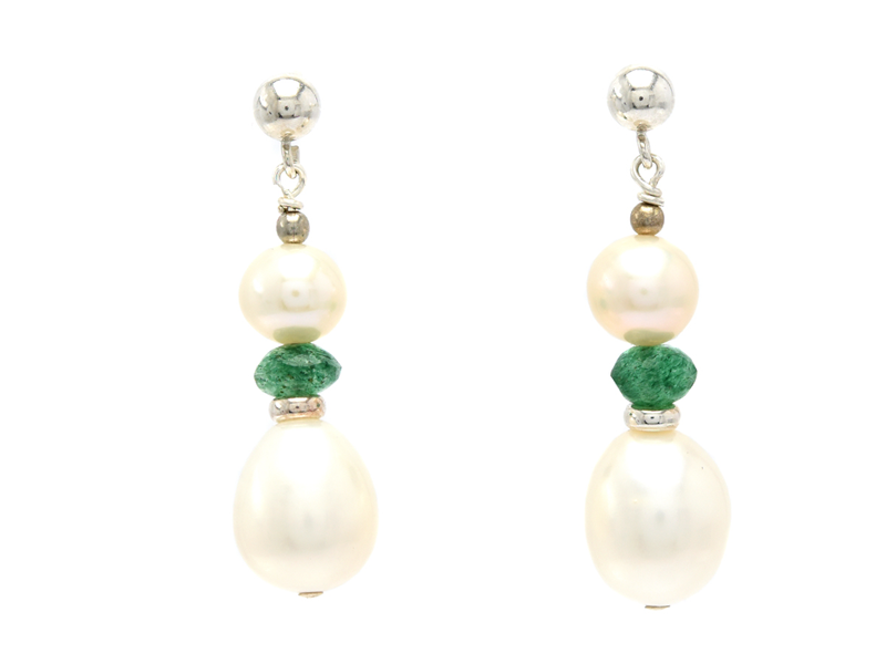 EARRINGS, sterling silver, cultured freshwater pearls, dyed faceted emeralds by lower quality, pushback, weight 3,8 g.
