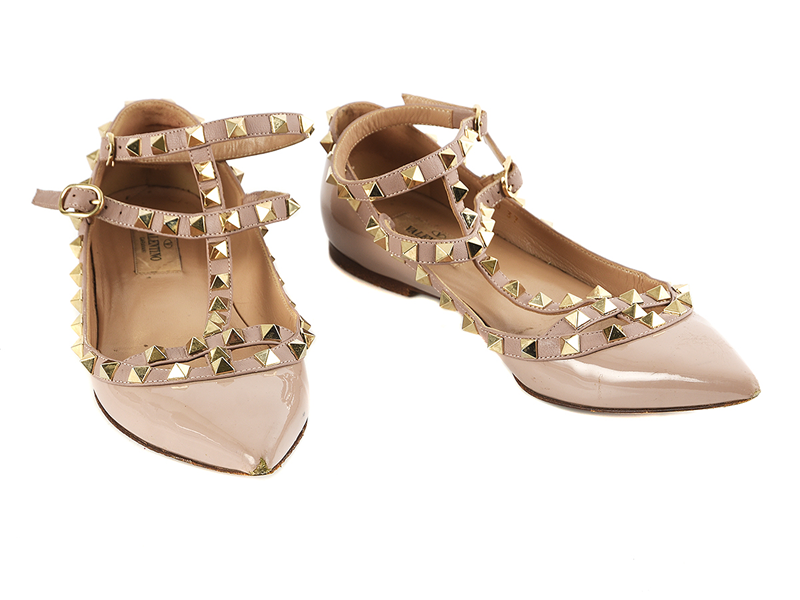 SHOES, VALENTINO, Rockstud Flats, size 37, nude patent leather, studs i yellow metal, worn.