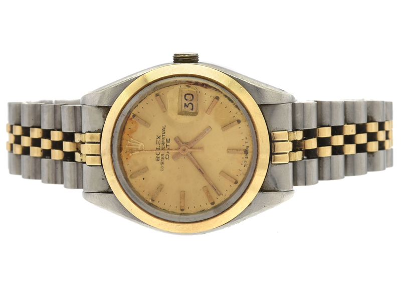 ROLEX, Oyster Perpetual, Date (T Swiss T), Ref no. 6916, Serial no. 4202543, Cal 2030, Movement no. 46174, Case no. 6917, ladie´s wristwatch, 26 mm, steel/gold, self winding, plastic crystal, date, damaged dial, missing crown, defect, ATT: see detailed information, engraving, Jubilee bracelet, folding clasp, Ref no. 62523-A14/468J, approx 1976.