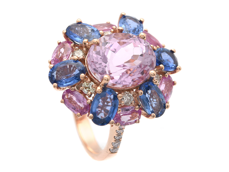 RING, 18K rose gold, oval-cut kunzite approx 5,01 ct, 6 oval cut blue sapphires approx 3,49 ctw, 6 oval cut pink sapphires approx 1,60 ctw, 16 brilliant cut diamonds approx 0,36 ctw, approx W-LB/SI-P, size 16,75 + mm, weight 7,2 g.