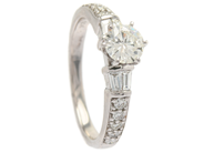 RING, 14K white gold, brilliant cut diamond approx 0,57 ct, W/VS2, 14 pcs diamonds approx 0,50 ctw, stl17 mm, weight 3,6 g. RING, 14K white gold, brilliant cut diamond approx 0,57 ct, W/VS2, 4 trapeze cut diamonds approx 0,18 ctw, approx TW-W/VS, 10 brilliant cut diamonds approx 0,32 ctw, approx TW-W/VS, size 17 mm, weight 3,6 g. Center stone is set with somewhat skewed prongs.