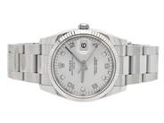 ROLEX, Oyster Perpetual, Date, Chronometer, Ref no. 115234, Serial no. Q8514966, Cal 3135, Movement no. 48Y62661, Case no. 2330, unisex, 34 mm, steel/white gold, self winding, sapphire crystal, date, diamond dial (5 pcs. 8/8), Oyster bracelet, folding clasp, Ref no. 72190A-1HJ, certificate, October 2016, box, paper box.