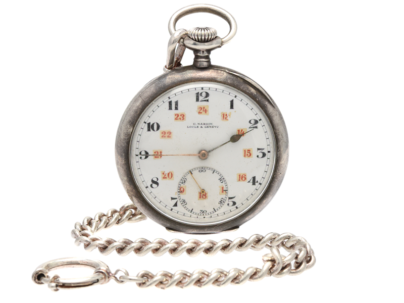 U.NARDIN, Locle & Genève, pocket watch, 51 mm, Serial no. 401591, Case no. 319539, silver (0,900), lever escapement, replaced hands, damaged dial, engraving, approx 1920, pocket watch chain i white metal.
