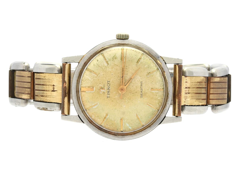 TISSOT, Seastar, men´s wristwatch, 34,5 mm, Cal 27B-1, Serial no. 4686610, Case no. 51049 / 51050-2, steel, manual winding, plastic crystal, damaged dial, ATT: rust in movement, approx 1960, metal bracelet not original.