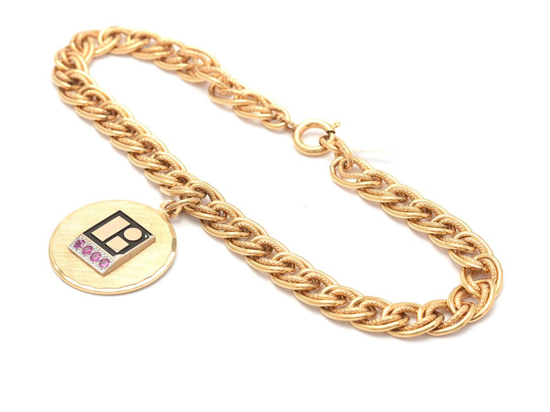 Bracelet 12K 12,5g, length: 19cm, width: 6mm, with integrated double-dyed pendant with red stones