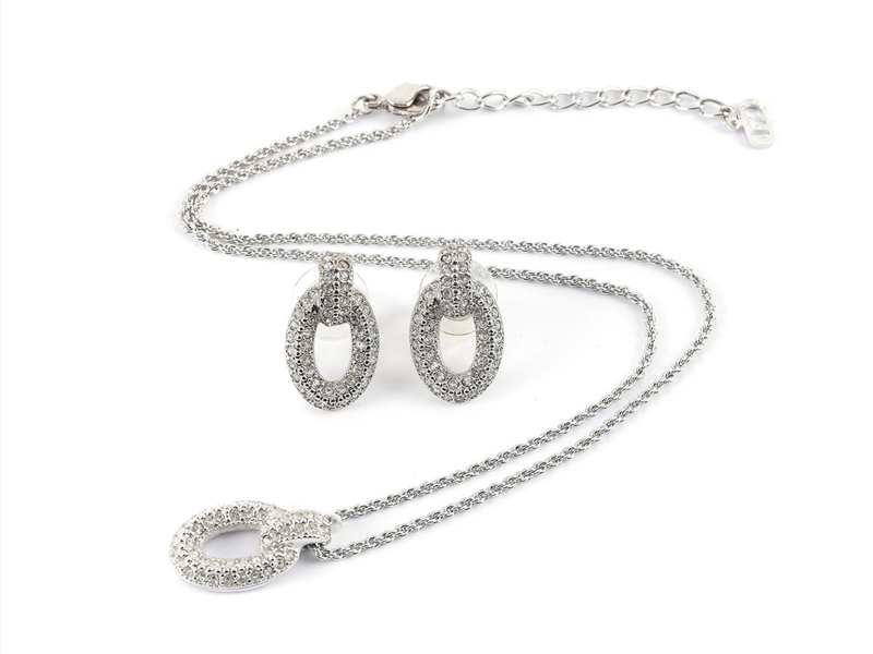 SET OF JEWELLERY, CHRISTIAN DIOR, silver-tone chain, white stones, 45 cm, earrings, silver-tone, white stones, pushback, one push back are broken, dustbag.