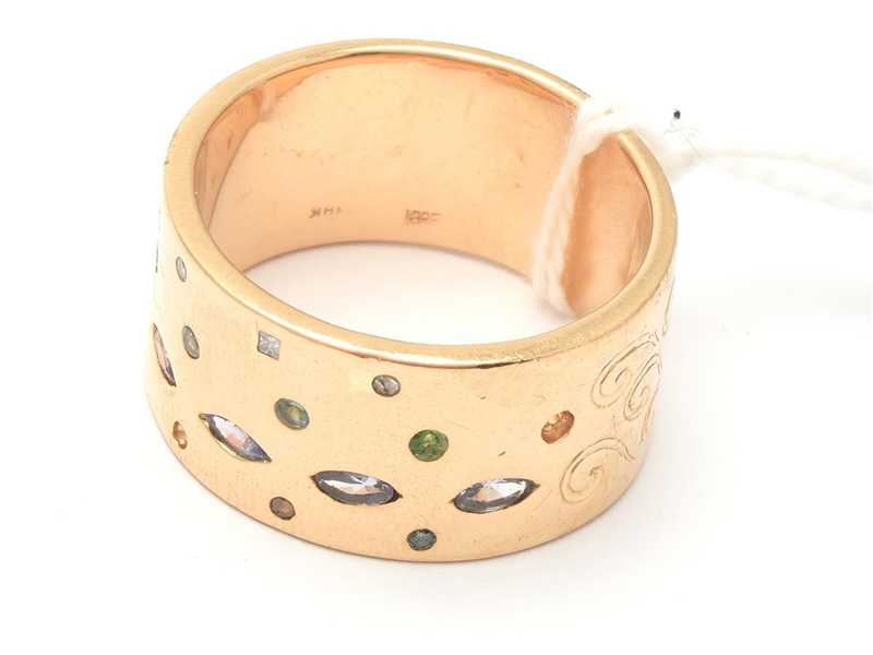 Ring 18K 22,7g Ø21, with diamonds 2xca0,01ct of which one damaged, 1xca0,01ct princess cut, 1xca0,01ct yellow, 1xca0,01ct green, with stones of which two damaged and two missing, patterned, scratched